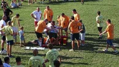 »Nedelja, 2. julij 1995, ob 14. uri v Dobu – otvoritev nogometnega igrišča s spektakularno tekmo DEBELI : SUHI. Pridite, nasmejali se boste!«